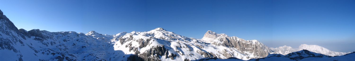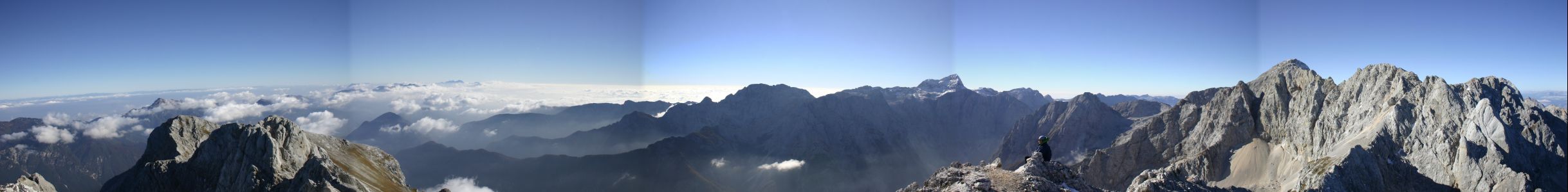 Vom Gipfel des Dovski Kriz, Julische Alpen auf Kukova Spica, Karawanken im Hintergrund, Triglav, Stenar, Skrlatica, Rokav und Oltar