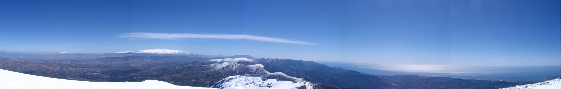 Vom Gipfel des La Maroma: Sierra Nevada mit Mulhacen und die Südspanische Küste mit Mittelmeer