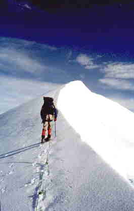 und dann über die kurze Eisflanke zwischen den beiden Gipfeln, dann auf dem