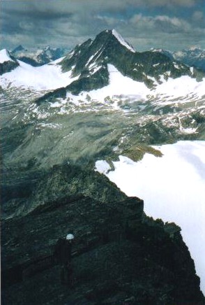 Mt. Sifton , fotografiert vom Tuppergrat. Rechts die Aufstiegsroute auf Schnee und Eis.